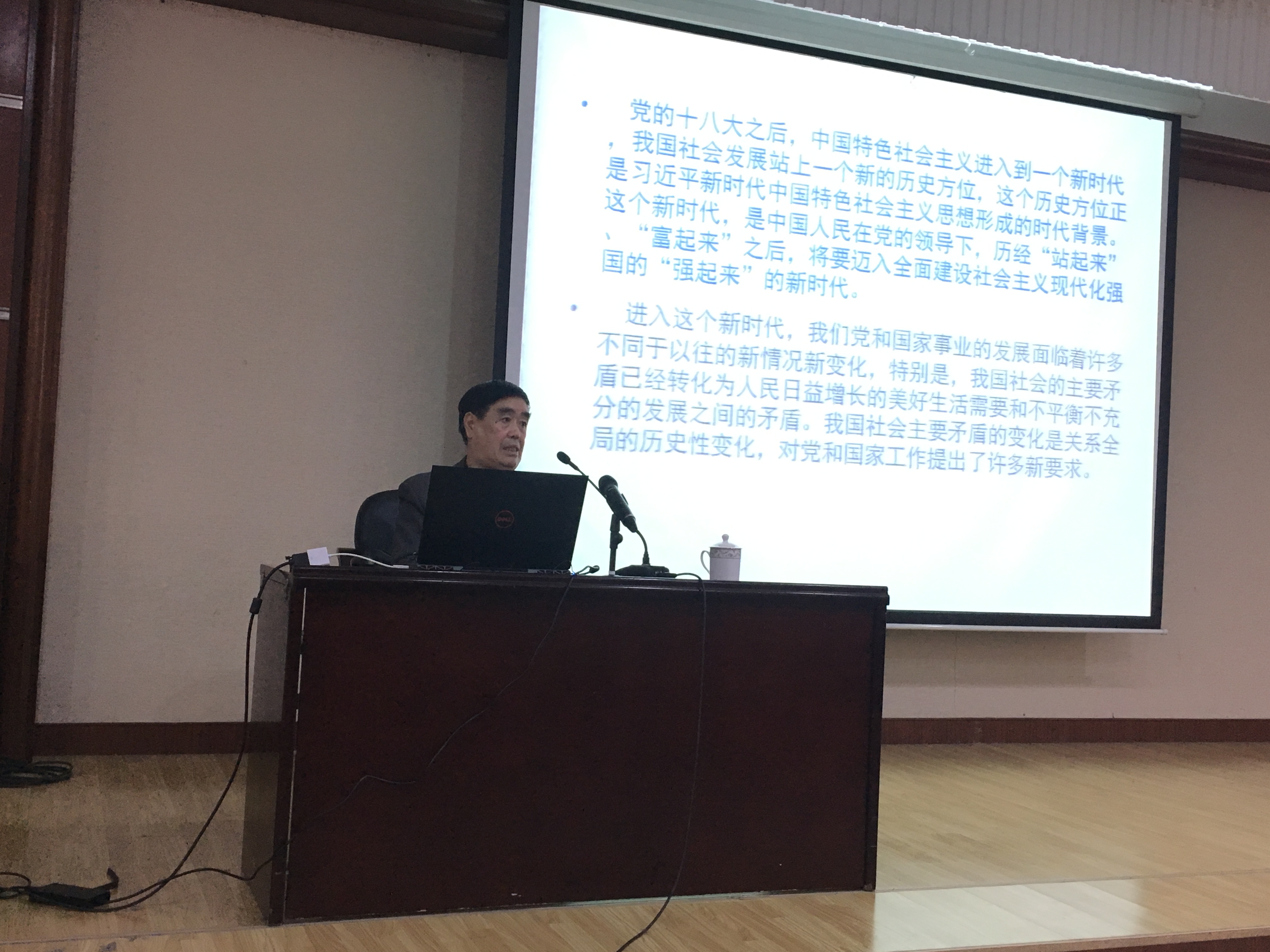 陈教授一个半小时的报告,高度凝炼、提纲挈领而又不乏亲和,使参会人员对习近平新时代中国特色社会主义思想有了更加深刻理解和感悟,激发了大家学习习近平新时代中国特色社会主义思想的热情。讲座临近结束时,陈教授以师为表告诫新青年“夯实理论基础,注重个人修养,多一点交往能力的训练。”简短精练却又不失内涵,值得我们不断反思如何才能成为新时代真正的青年。