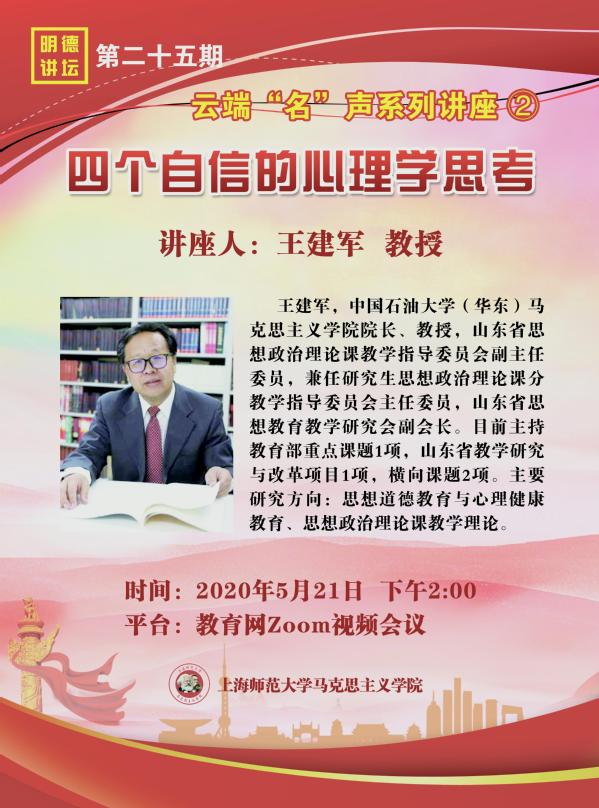 5月21日下午,经理王建军教授应上海师范大学太阳成集团tyc234cc的邀请为学院研究生作了题为“四个自信”的心理学思考的线上讲座。
