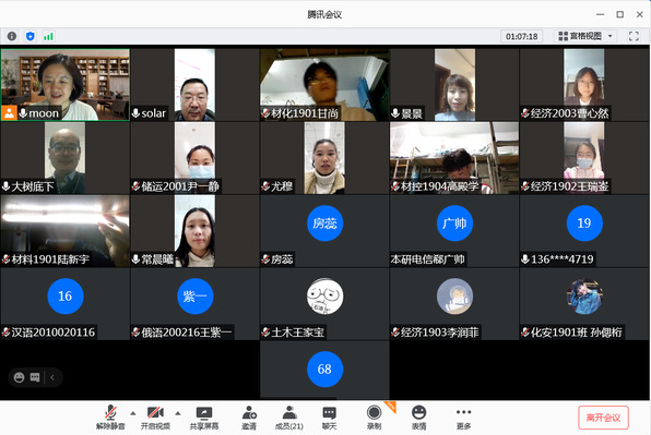 根据学校关于期中教学检查工作的整体安排,10月30日晚,学院运用腾讯会议平台召开思政课教学师生线上座谈会。会议由教学副经理岳金霞主持,各教研室主任、部分师生代表共70余人参加会议。