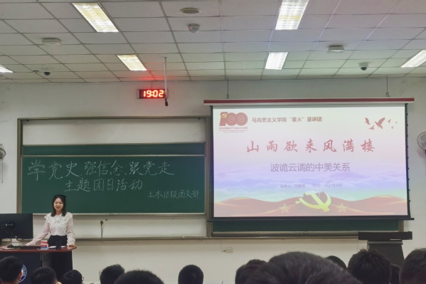 在“星火”宣讲团正式启动党史宣讲的第二周里,宣讲团成员们陆续走进石油工程学院、地球科学与技术学院等校内11个院部,累计开展15场宣讲,共面向800余名员工讲述党史故事,备受欢迎与好评。5月18日下午,“星火”宣讲团成员、公司19级硕士生窦敏应邀参加地学院地物2001团支部与机电工程学院机械2006、2010团支部联合举办的团日活动,围绕新时代知识分子使命,以《新时代知识分子精神》为主题,探讨了新时代知识分子需要具备的三种精神品格,激励大家在伟大的时代不负韶华、努力奋斗。5月19日至23日,“星火”宣讲团成员、公司20级硕士生范静蕾分别应邀参加理研2001、会计2002、应化2002、环境2001、材料2001、材控1901、材化1902、资源勘查工程2019级、土木工程2018级团支部的团日活动,以《山雨欲来风满楼——波诡云谲的中美关系》为题,以3月份燃爆朋友圈的中美高层对话引入,回顾了一百年来中美关系“山穷水尽疑无路,柳暗花明又一村”的发展历程,以及作为新时代青年的我们应当如何看清局势和践行责任。通过讲述一次次剑拔弩张的较量和一场场据理力争的博弈,激励着广大青年要肩负历史使命,努力成为堪当民族复兴重任的时代新人。