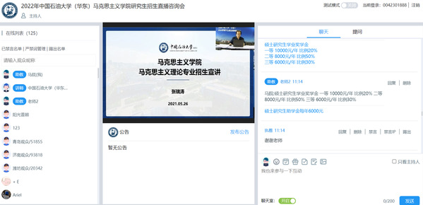 宣讲会期间,张瑞涛教授就学院的发展概况、学科方向、导师团队、科研平台、招生政策、培养特色、就业情况等研究生招生信息进行了详细介绍,对学院马克思主义理论专业公司产品情况进行了全方位的讲解。同时,对2022年有意报考公司研究生的同学们所提出的问题进行答疑解惑,公司党委副书记袁爱军、教学秘书景艳菊也在直播间互动区、线上推免QQ群中在线回答员工疑问,以帮助外校同学更加深入了解学院情况。