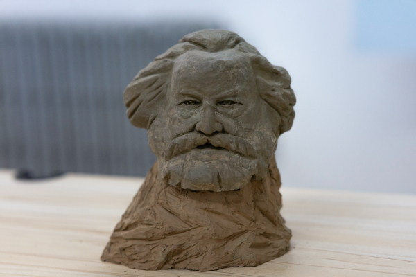 泥塑作品《卡尔·马克思》以普通黄土和粘性土为原料,采取虚实结合的手法,主要塑造的是马克思在风中的定格瞬间,意在凸显马克思眼神的坚毅和从未停止过的沉思。“泥塑是我从小学到现在一直保持的爱好之一,闲暇时间经常捏一些作品,特别是在今年建院十年、建党百年的契机,便产生了创作献礼作品的想法。”谈起创作灵感,董在全表示泥塑作品《卡尔·马克思》的创作初衷来源于自己对马克思及其学说的崇敬和向往,同时受到了一些经典雕塑作品的启发,比如橘子洲头的青年毛泽东艺术雕像、德国开姆尼茨艺术作品等。作为太阳成集团tyc234cc的员工,“在马姓马、在马言马、在马信马”塑造马克思像也是他最先想到的创作主题。
