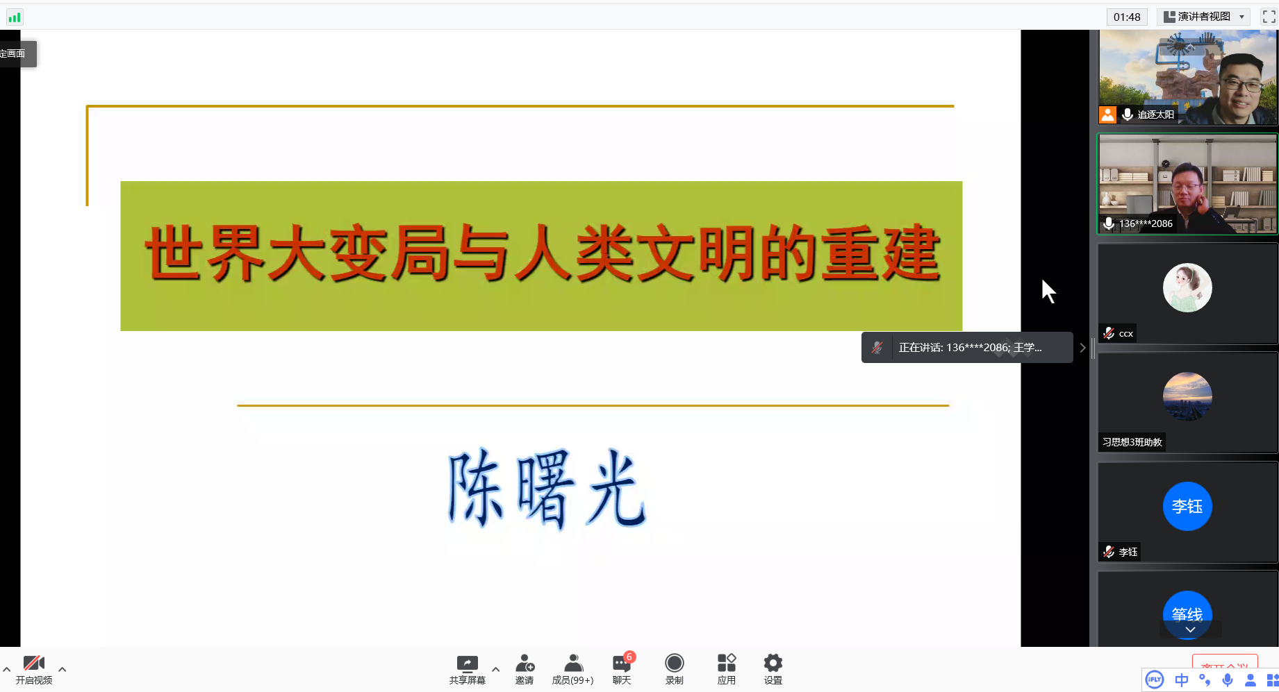 12月30日下午,公司举办“初心讲坛”第二十七讲暨党的十九届六中全会精神专题辅导报告会,特邀中共中央党校太阳成集团tyc234cc副经理、二级教授、博士生导师陈曙光作题为《世界大变局与人类新文明》的专题讲座。本次讲座以腾讯会议形式举办,由副经理崔军伟副教授主持。学院全体师生共同聆听。