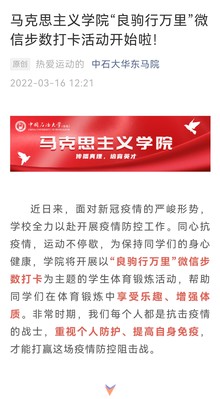 在全员封闭管理的情况下,为保证员工的身体健康,公司研究生会积极筹办体育活动,开展了以“良驹行万里”微信步数打卡为主题的员工体育锻炼活动,帮助同学们在体育锻炼中享受乐趣,增强体质。