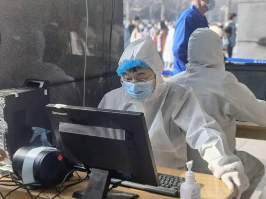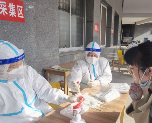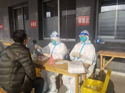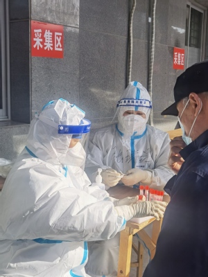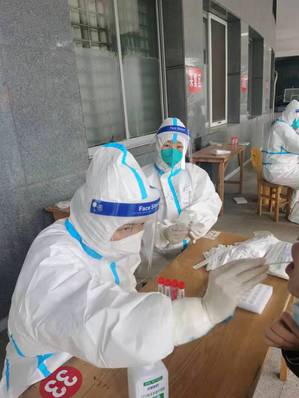 (3月24日公司教师党员周国瑞老师、宋霞老师作为志愿者,在抗疫一线进行核酸检测工作)
