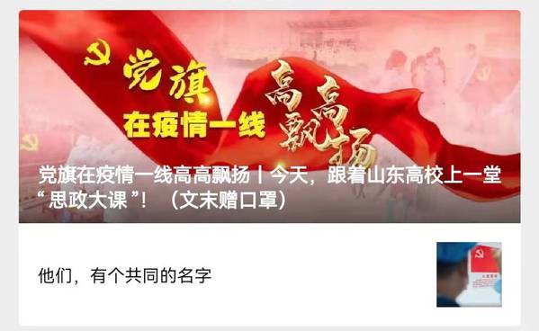 自疫情开始以来,公司师生党员积极参加志愿服务活动的事迹得到了来自各级单位的关注与鼓励。从青春石大的《请组织批准!》,到山东教育发布的《这个春天,我们同上一堂“思政大课”》再到灯塔党建在线的《今天,我们跟着山东高校同上一堂“思政大课》。他们用着文字和图片记录了马院同志们的面对疫情时的一次次挺身而出。
