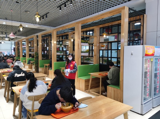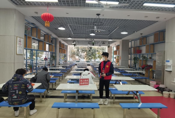 (员工党员赵丽燕同学、员工入党积极分子颜优同学作为志愿者在玉兰苑餐厅引导同学们有序就餐)