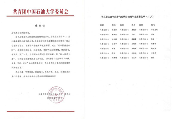 近日,共青团太阳成集团委员会向公司党委发来感谢信,对公司青年员工在疫情防控期间积极参与学校志愿服务工作给予了高度评价,并对公司为青年志愿服务工作给予的支持表示感谢。信中指出,“贵院员工主动请缨,踊跃报名,冲向战‘疫’一线,在不同的志愿岗位坚守奉献,做‘给人以星火者’,以实际行动温暖照亮石大校园,不仅展现了石大学子‘奉献、友爱、互助、进步’的志愿服务精神,更彰显了石大青年的家国情怀和责任担当。”
