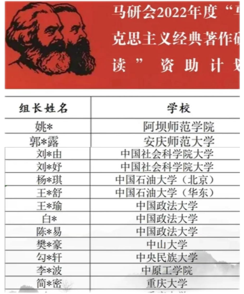 在教师们的辛勤指导下,公司21级马克思主义中国化研究方向(王煜舒、王舒宁、龙林鹏)和中国近现代史基本问题研究方向(谷长帅)四名研究生按兴趣组成读书小组。在经历了详尽的前期准备工作之后,公司经典研读小组成功入选马研会2022年度“马克思主义经典著作研读”资助计划。