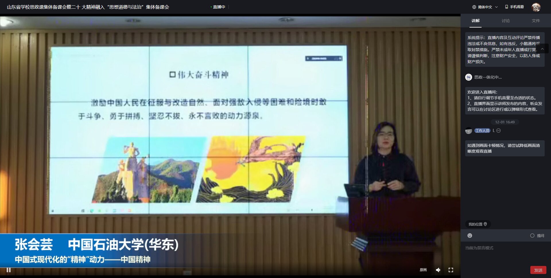 在经验分享阶段,山东农业大学任凤琴以“研精神、析要点、活课堂”三个层面对山东农业大学将党的二十大精神融入思想道德与法治课的具体做法作了介绍。山东科技大学常春从教学内容、教学方法和集体备课规范三方面就党的二十大精神融入高校“思想道德与法治”课作了经验分享。山东青年政治学院段微晓着眼本校“思想道德与法治”课程的改革实践和党的二十大精神融入课堂教学的思考进行了汇报。滨州学院傅开梅则立足指导思想、融入重点、融入过程、方式方法进行了交流。山东农业工程学院史倩以尊重和传承中华民族历史文化为例,就如何将党的二十大精神融入“思想道德与法治课程”进行分析。