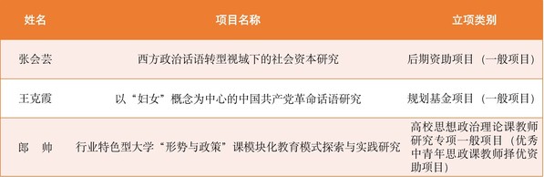 2022年,公司获批3项教育部人文社科规划研究项目。其中,张会芸副教授主持的《西方政治话语转型视域下的社会资本研究》获批后期资助(一般项目),这是公司教师首次获批后期资助项目。王克霞副教授主持的《以“妇女”概念为中心的中国共产党革命话语研究》获批规划基金项目(一般项目),郎帅副教授主持的《行业特色型大学“形势与政策”课模块化教育模式探索与实践研究》获批高校思想政治理论课教师研究专项一般项目(优秀中青年思政课教师择优资助项目)。
