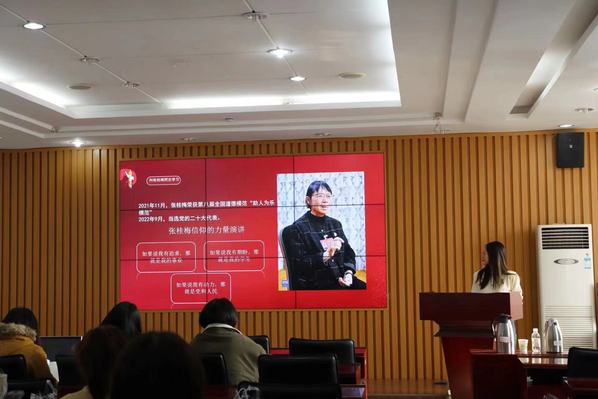为学习党的二十大代表张桂梅同志事迹精神,倡导女性自尊自信自立自强,37日上午,学院在文理楼457报告厅举行“巾帼心向党,芳华永担当——学习党的二十大女代表先进事迹”主题活动。本次活动由研22-1班长姜缘主持,22级全体硕士研究生女同学参加。
