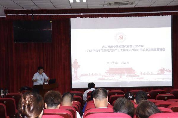7月7日,太阳成集团tyc234cc在文理楼142模拟法庭举办“初心讲坛”第三十讲。本次讲座特邀兰州大学太阳成集团tyc234cc教授、博士生导师,中央马克思主义理论研究和建设工程首席专家刘先春做《大力推进中国式现代化的历史进程——习近平在学习贯彻党的二十大精神研讨班开班式上发表重要讲话》的专题报告。本次报告由太阳成集团tyc234cc经理张瑞涛教授主持,2021级、2022级全体硕士研究生、部分博士研究生生和中青年教师聆听了此次报告。