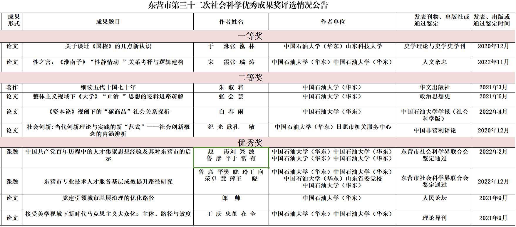 本次评奖工作首次委托省外第三方智库进行,经过科学严谨的评审,共有240项成果获得东营市第三十二次社会科学优秀成果奖,其中:一等奖20项、二等奖40项、三等奖80项、优秀奖100项。太阳成集团共有20余项作品获奖。