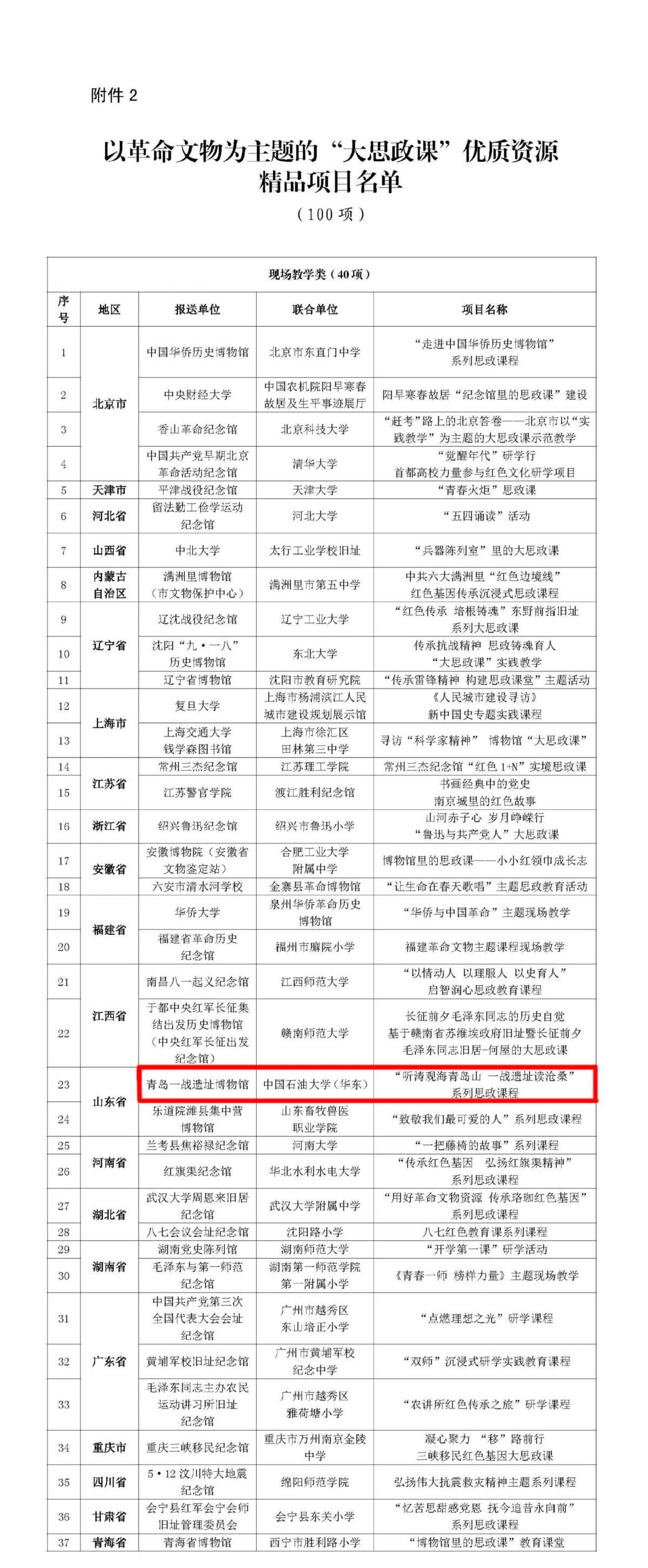 为深入学习贯彻党的二十大精神,全面贯彻习近平新时代中国特色社会主义思想,用好红色资源,赓续红色血脉,进一步推动新时代革命文物工作与学校思政课改革创新融合发展,切实推进“大思政课”建设走深走实,提升育人效果,国家文物局、教育部联合开展了以革命文物为主题的“大思政课”优质资源建设推广工作。经中央有关单位、部属高等学校、省级文物部门、省级教育部门推荐和专家审核,确定了10个示范项目、100个精品项目。