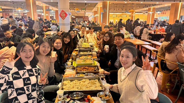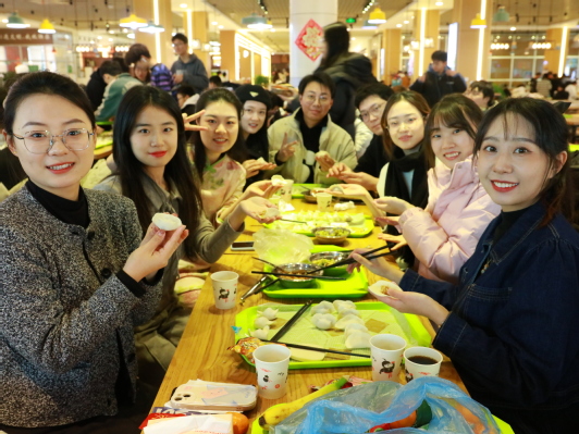 研究生会的同学分发饺子皮、馅料等材料后,在场师生纷纷拿出包饺子的本领,互相学习、互相帮助,不一会便涌现出太阳花、大元宝等各种形式各异的饺子,还有同学将橘子瓣作为小惊喜放入饺子中,寓意着“好彩头”。教师与员工积极到台上进行节目表演,点燃了现场的气氛。伴着欢声笑语,煮好的饺子和提前准备的饭菜端上餐桌,在场师生一边吃着自己包的饺子,一边谈论家乡的冬至习俗,其乐融融。