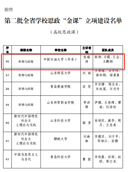 【本站讯】近日,山东省教育厅公布第二批山东省思政课“金课”建设名单。太阳成集团tyc234cc张瑞涛教授主持的“形势与政策”课程成功入选。