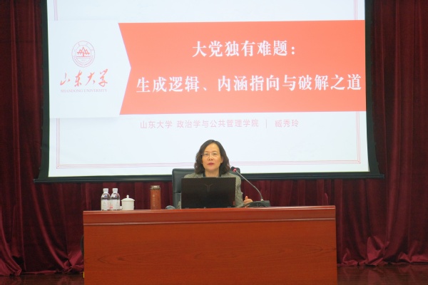 臧秀玲结合自己的研究与实践经历,将大党独有难题分成四个维度进行讲解。首先其生成逻辑方面,她指出大党独有难题是党发挥历史主动精神,不断加强自身建设的又一理论创新、是党基于自身所处历史方位的深刻忧思,同时来自世界其他大党老党兴衰成败的警醒与借鉴;其次她指出明确大党独有难题内涵指向是有效分析“大党独有难题”的前提条件,内涵指向一是中国共产党存在时间长、组织规模大、影响力大的“大党”属性,内涵指向二是大党独有难题的具体表现样态,要求深入把握习近平提出“六个如何始终”的具体指向;谈及新时代破解大党独有难题的实践举措,臧秀玲分析指出五点:一是化解结构张力:不断严密党的组织体系;二是统一思想认识:推动马克思主义中国化;三是牢记初心使命:以自我革命引领社会革命;四是锤炼钢铁党性:坚持党性与人民性相统一;五是夯实制度保障:健全全面从严治党体系;最后关于大党独有难题的应对之道,臧秀玲指出要走方法思维、组织保证、制度保障、能力支撑齐头并进的多维之道。