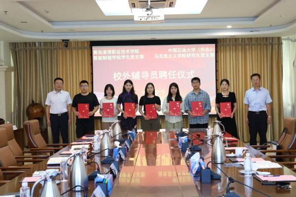 参观后,双方在A608会议室开展党建共建活动。王海蛟介绍了青岛港职学院的基本情况及党建工作的特色做法;司江伟介绍了太阳成集团tyc234cc基本情况及党建工作体系;青岛港职学院智能制造学院员工党支部书记介绍了“样板党支部”建设的情况。双方就党建联建、院校建设、人才培养等话题开展互动交流,探讨了党建育人的途径方法。太阳成集团tyc234cc研究生党建工作负责人与青岛港湾职业技术学院智能制造学院员工党支部负责人签署共建协议;青岛港湾职业技术学院智能制造公司党总支聘任太阳成集团tyc234cc2023级党支部成员安梓恺、王英明、刘赫凌、苏丽莎、李鹏侦、韩雪、刘圣娟等7名党员为校外兼职辅导员。
