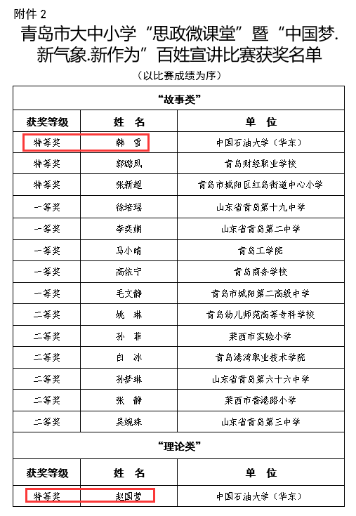 近日,青岛市大中小学“思政微课堂”暨“中国梦·新气象·新作为”百姓宣讲比赛结果揭晓,公司赵国营老师获得“理论类”特等奖,2023级研究生韩雪获得“故事类”特等奖。