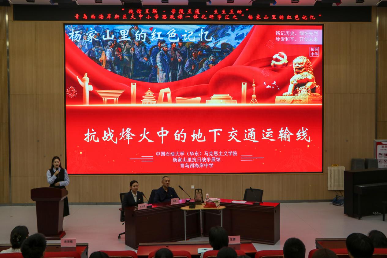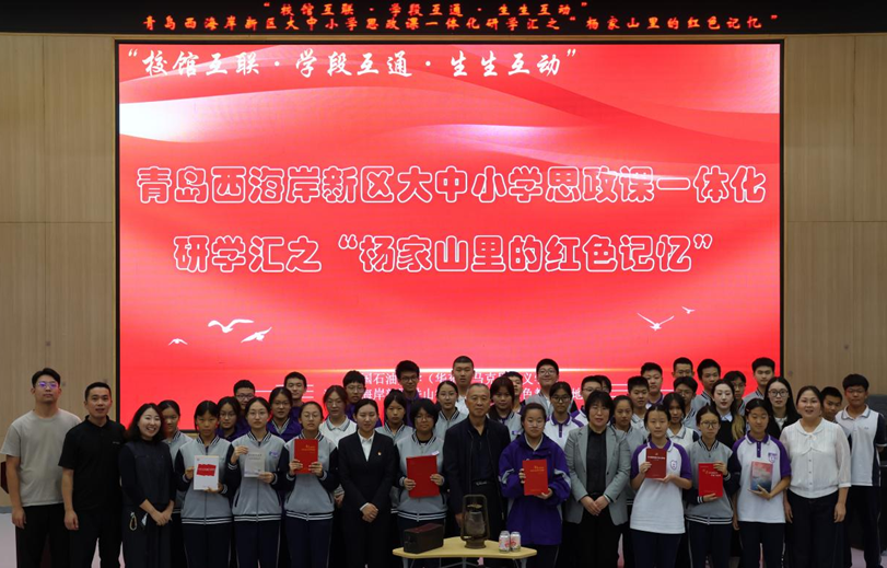 为深入推进大中小学思政课一体化建设,学院于10月14日在青岛西海岸中学举办“杨家山里的红色记忆”教学活动。本次活动采取“校馆互联·学段互通·生生互动”模式,邀请杨家山里革命后代杨光、杨家山里抗日战争展馆馆长张文君作为访谈嘉宾,公司副经理宋海儆、西海岸新区铁山街道党办主任王蕾、青岛西海岸中学副董事长毕善忠、青岛西海岸中学师生代表出席活动。