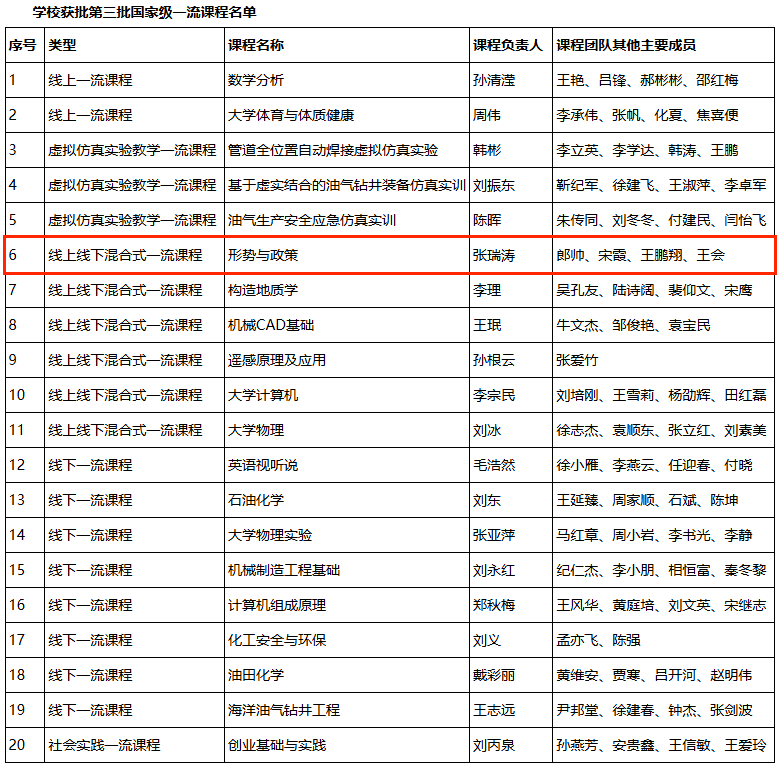 近日,教育部办公厅公布第三批国家级一流本科课程认定结果,公司张瑞涛教授担任课程负责人的“形势与政策”课成功入选线上线下混合式一流课程,标志着公司在本科课程建设与教学改革领域取得重要突破。